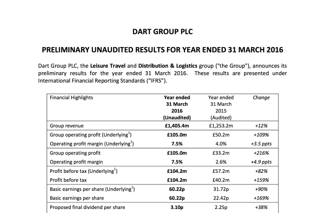 Dartgroup announces Preliminary Results 2016